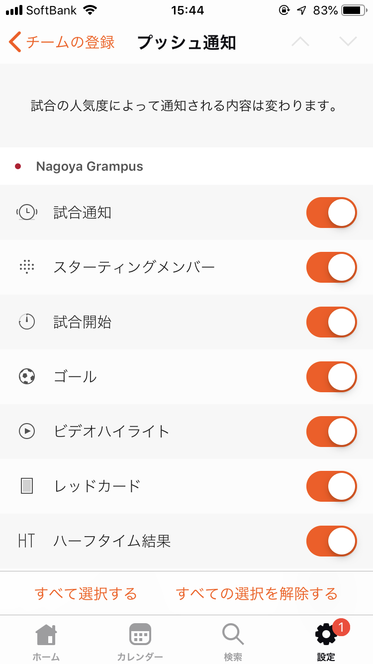 Jリーグでは対応をしていない通知項目は最初からオフにしてしまっても良いかと思います。