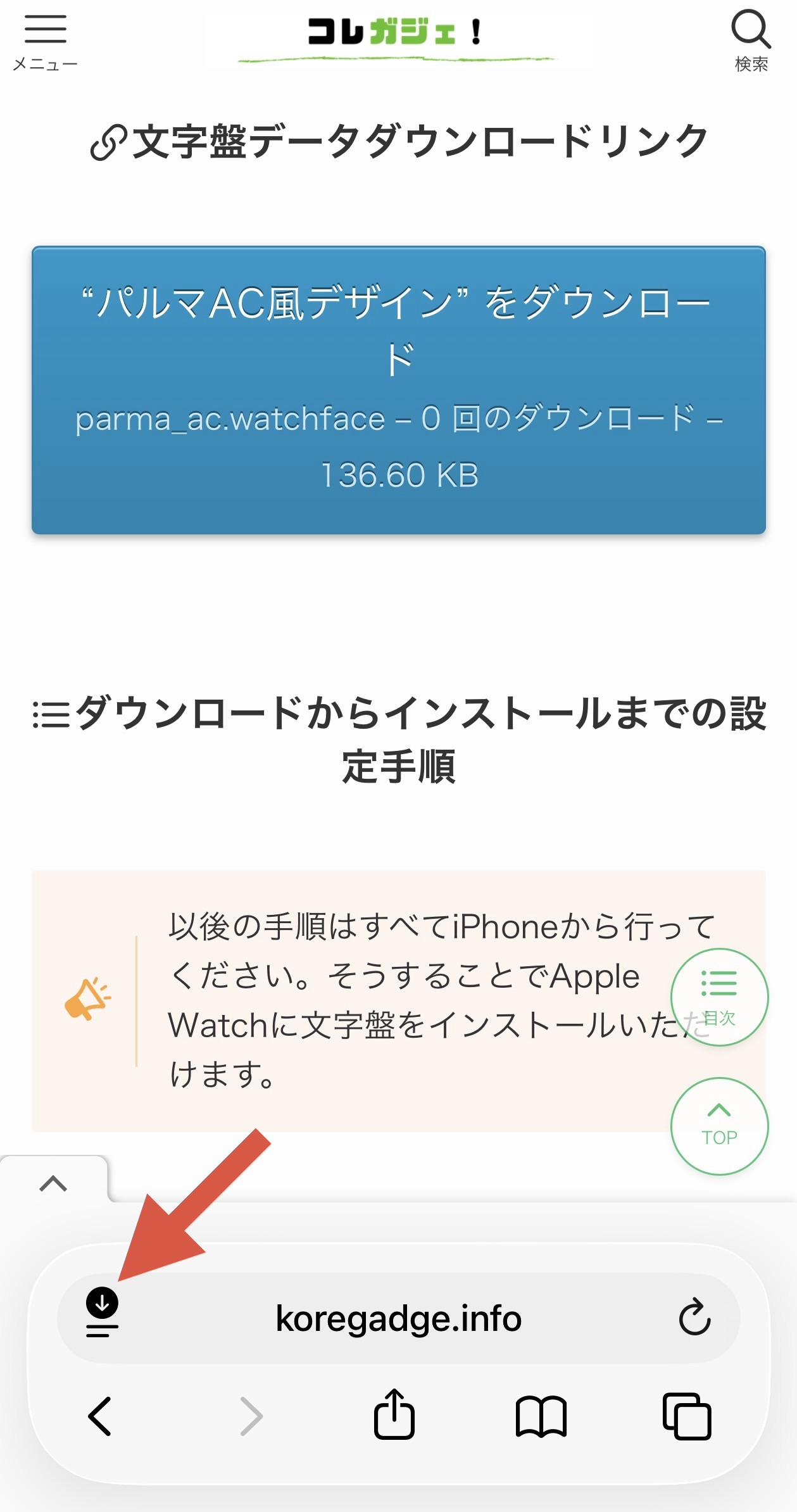ダウンロードが終わったら、Safariのダウンロードアイコン部分をタップ