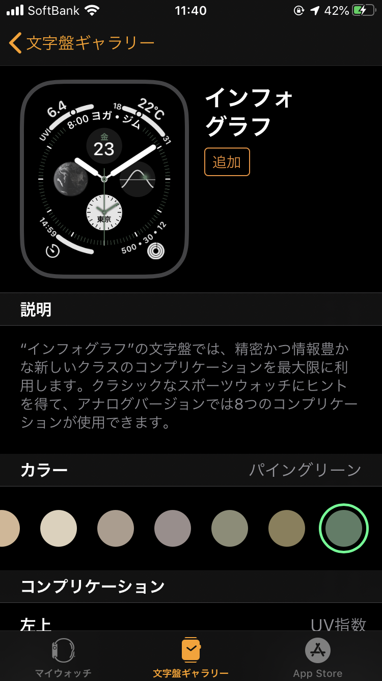 インフォグラフに設置できるコンプリケーションは、watchOS6で用意されている文字盤の中で一番多く、8個設置することができます。