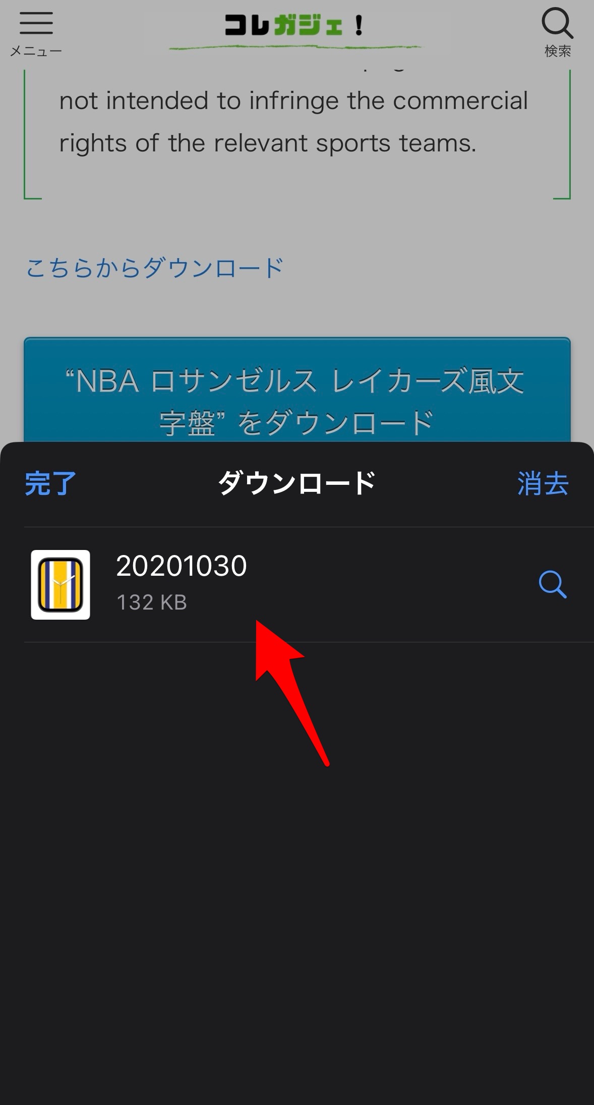 まずは【NBAロサンゼルス レイカーズ風文字盤をダウンロード】をタップ