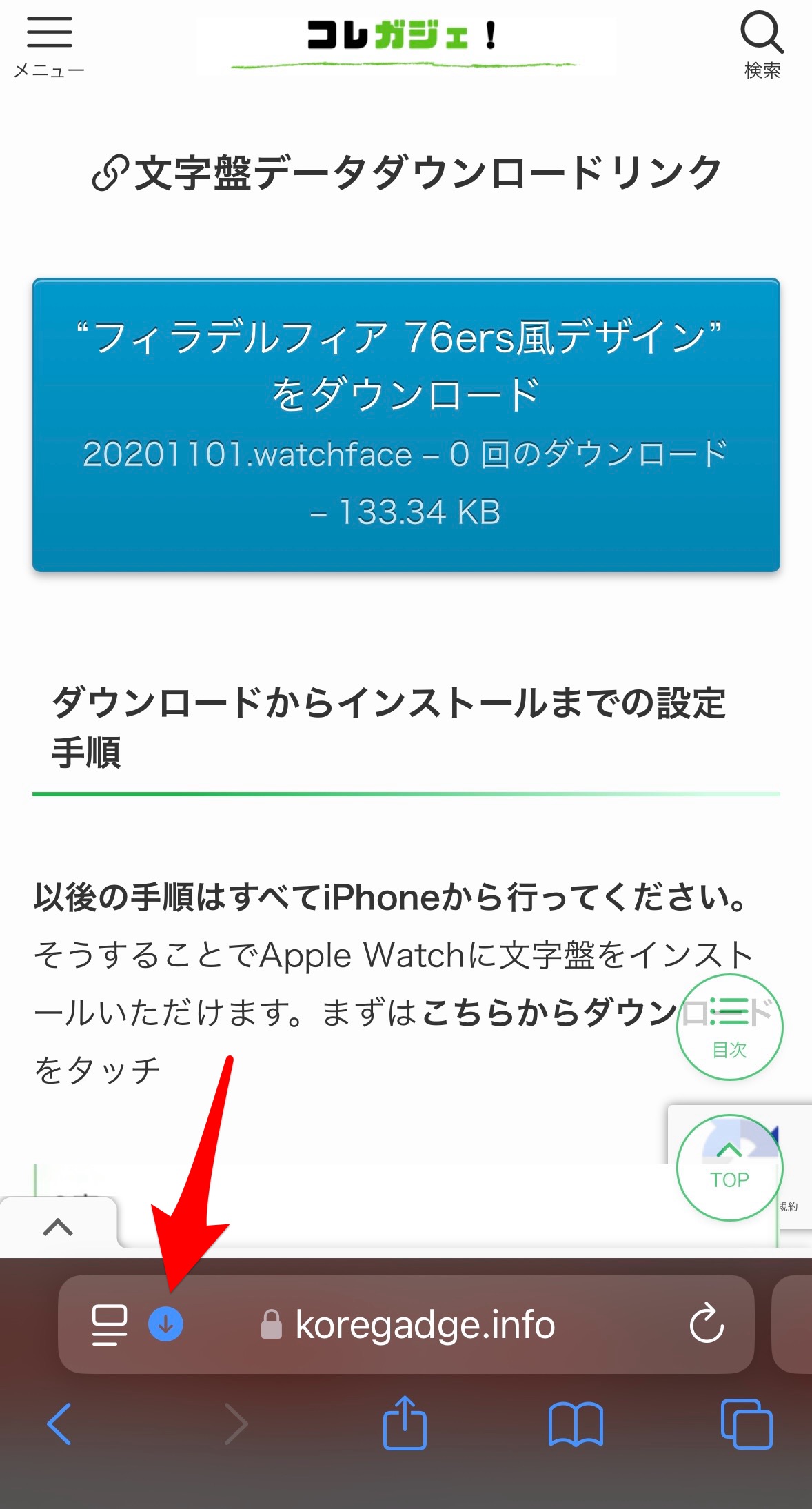 ダウンロードが終わったら、Safariのダウンロードアイコン部分をタップ