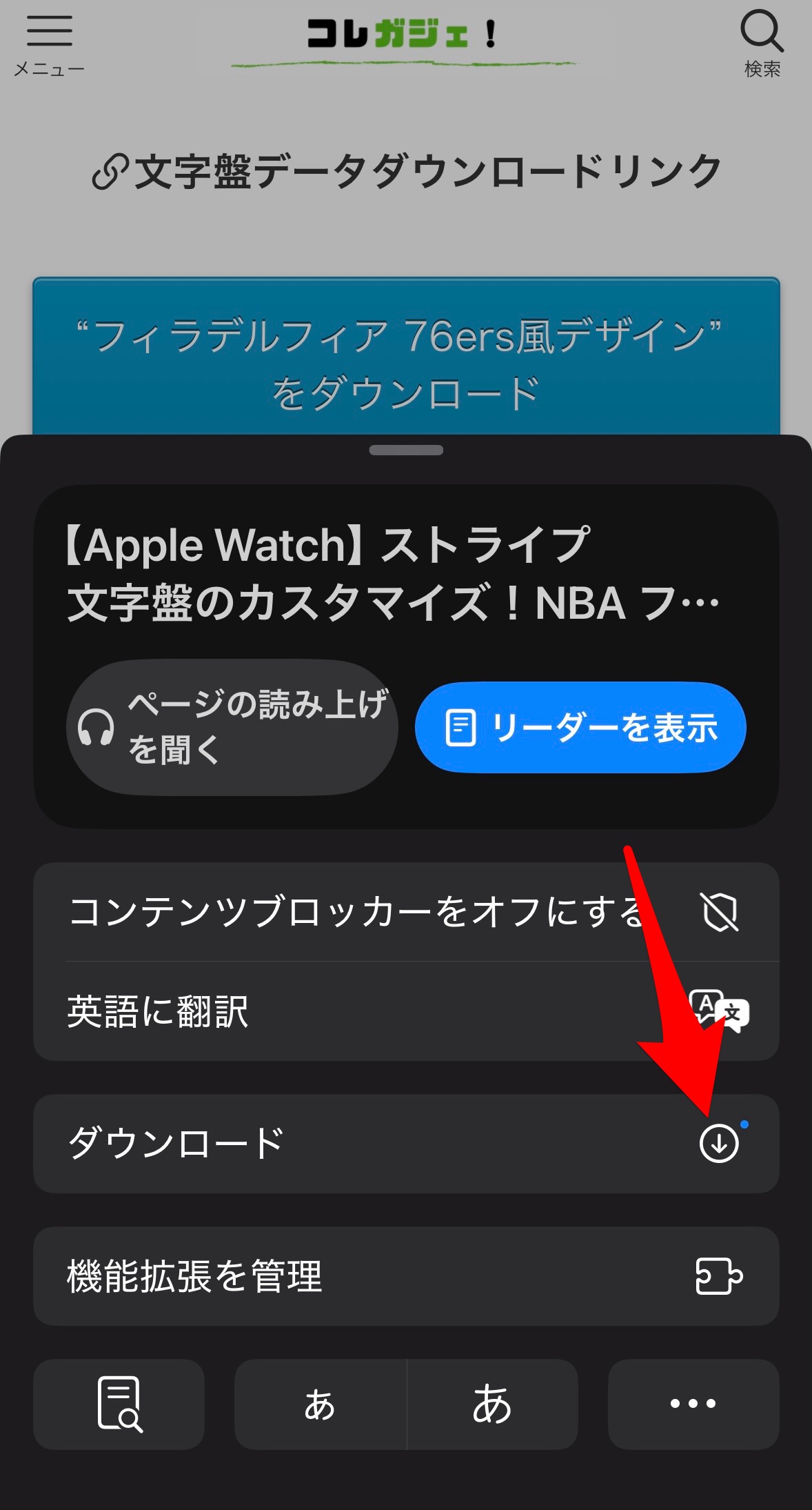すると、サブメニューが表示されるので、その中からダウンロードをタップ