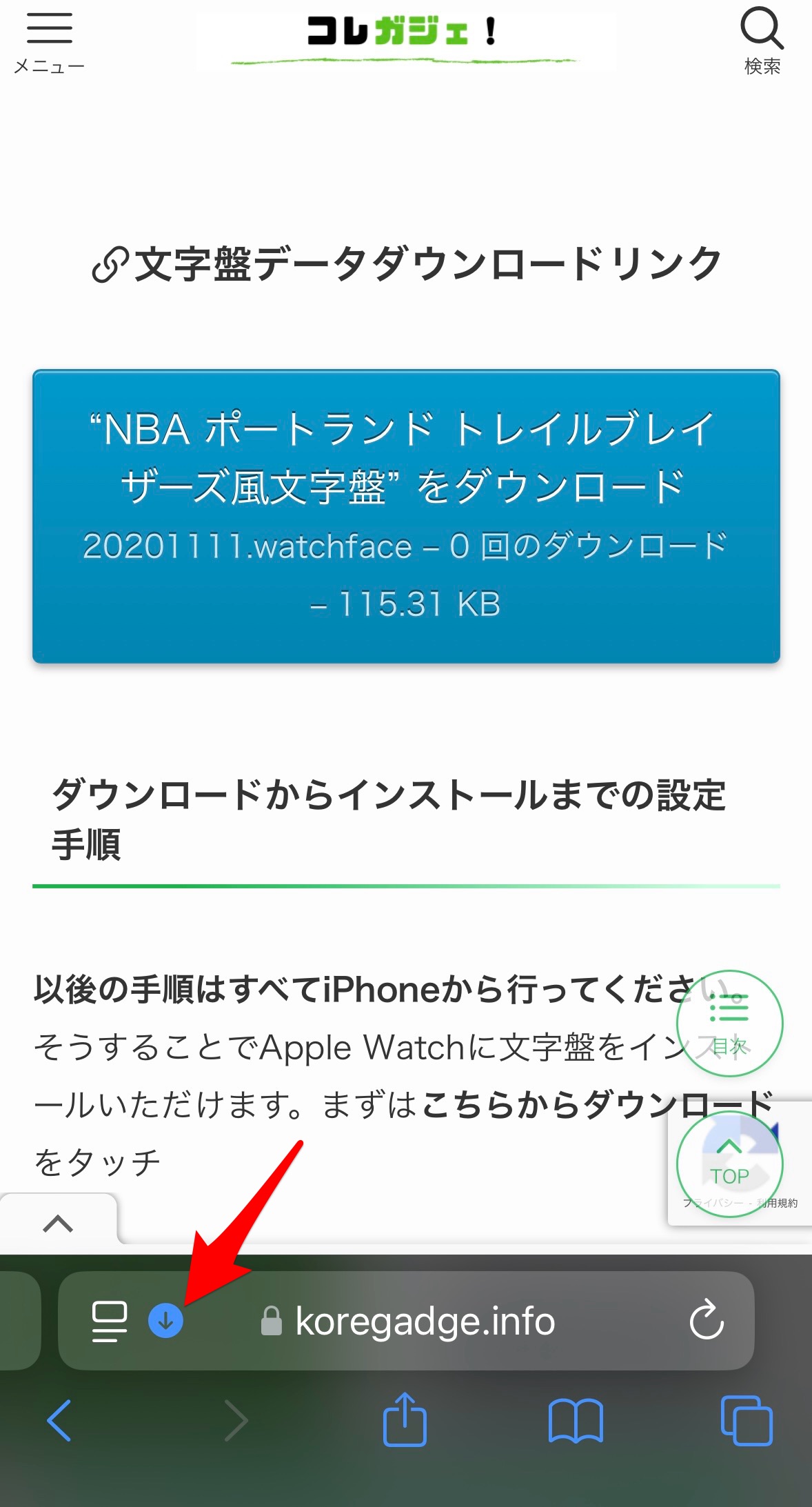 ダウンロードが終わったら、Safariのダウンロードアイコン部分をタップ