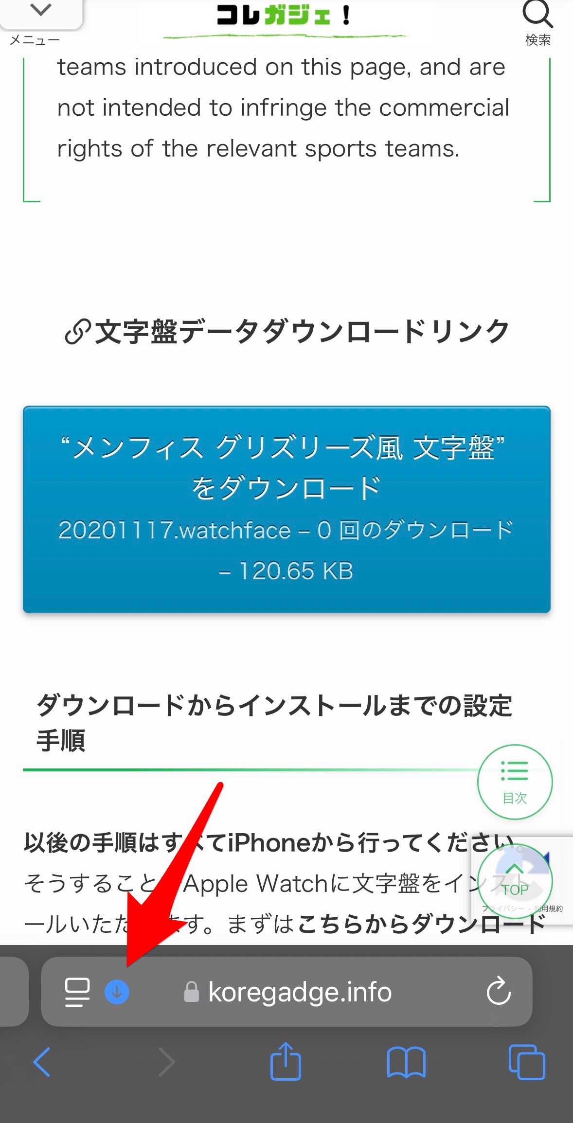 ダウンロードが終わったら、Safariのダウンロードアイコン部分をタップ